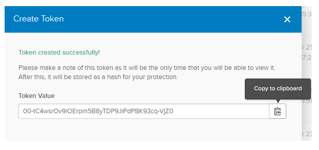 Note: Its very important you copy and save this token somewhere. Once you close this window you will not be able to retrieve this value again. You will have to delete the token and create a new one.