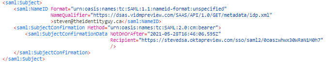 Okta will use the NameID in the Subject to appropriately map the user to a user within Okta: