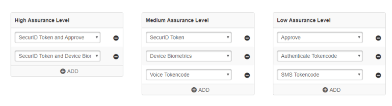 RSA SecurID Access provides 3 levels of assurance that you can leverage within your access policies. You have full control to modify the authenticators into the appropriate levels based on your licensing from RSA.