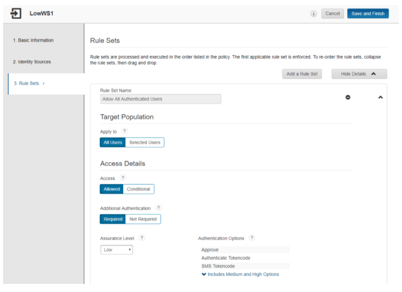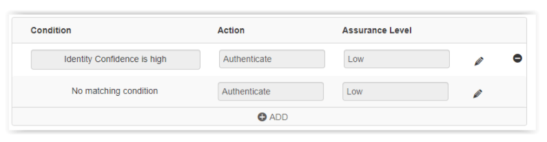I’ve actually left out a key element of the RSA SecurID Access solution, which is the Risk Level. Even though we’ve specifically called out the Low Assurance Policy, we can have RSA dynamically change that to High based on the user’s risk score. RSA SecurID Access can use an “Identity Confidence” score to choose the appropriate assurance level. This is configured in the access policy: