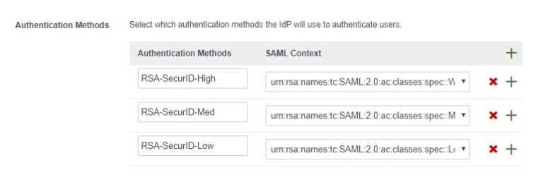 When you create a 3rd Party IDP for RSA SecurID Access, you can specify the AuthnContextClassRef when defining the authentication methods: