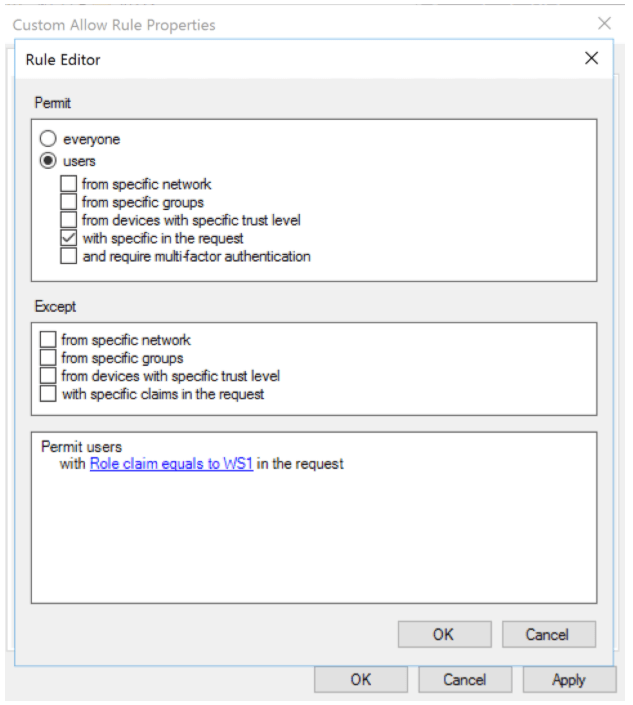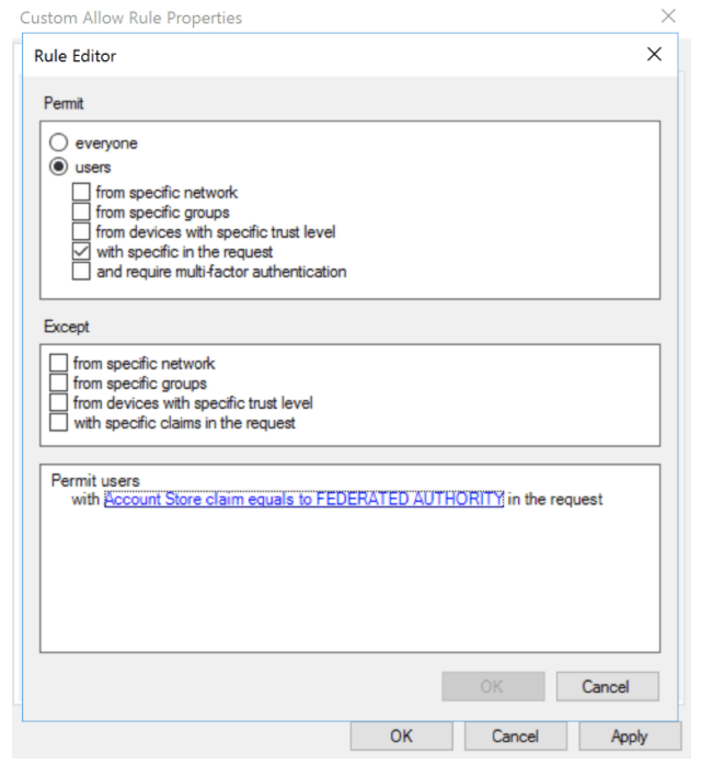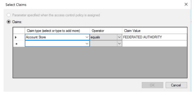 - Select “Account Store” as the the Claim type and “FEDERATED AUTHORITY” as the Claim Value