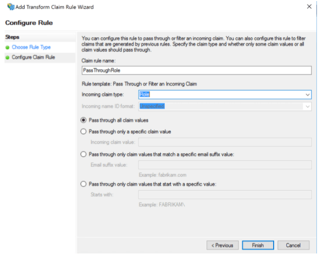 - Add the attribute “http://schemas.microsoft.com/ws/2008/06/identity/claims/role”