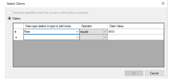 - Select “Role” as the the Claim and “WS1” as the Claim Value