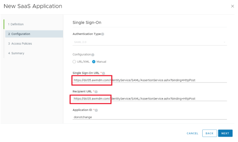 - Edit the Single Sign-On URL and Recipient URL with your UEM server