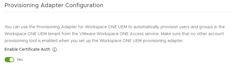 - Click the slider to enable Certificate Auth (Note: This assumes you’ve already enabled Workspace ONE UEM with Workspace ONE Access -> Identity Access Management -> Setup -> VMware Workspace ONE UEM