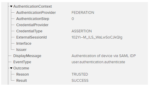 In the Okta Administration Console, go to Reports – > System Log. Look for the log entry “Authentication of device via SAML IDP”. Verify that the result coming from Workspace ONE Access is trusted by looking at the outcome:
