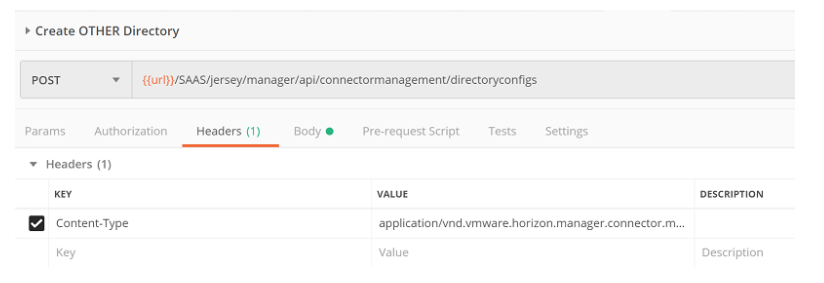 1. Under “Headers”, Set the Content-Type to “application/vnd.vmware.horizon.manager.connector.management.directory.other+json”