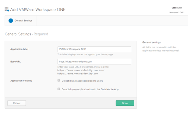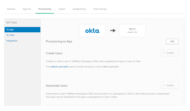 1. Okta is configured to use Workspace ONE Provisioning Application