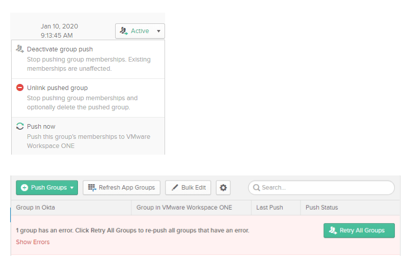 1. When pushing groups from Okta to Workspace ONE, Okta has a feature called “Push Now”. If you run into an error when using this capability, click the Retry All Groups button: