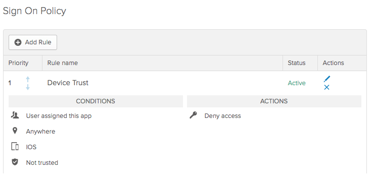 Now we can modify our sign-on policies for our applications. In your application specific sign-on policy, add a rule for either “IOS/Android” and select your appropriate device trust option and the correct action (DENY or MFA).