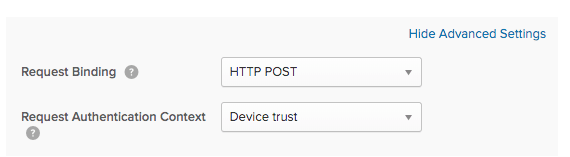In Security -> Identity Providers, you need to enable the Device Trust Authentication Context. (Note: This is under Advanced Settings). I’ll explain shortly what this option is doing.