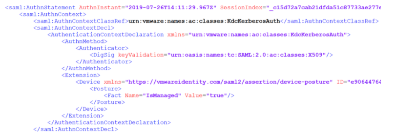 Workspace ONE Access will respond to Okta with the Authentication Class Reference that was used to authenticate the user along with the Device Posture Check. The Post Check returned will tell Okta whether the device is currently managed:
