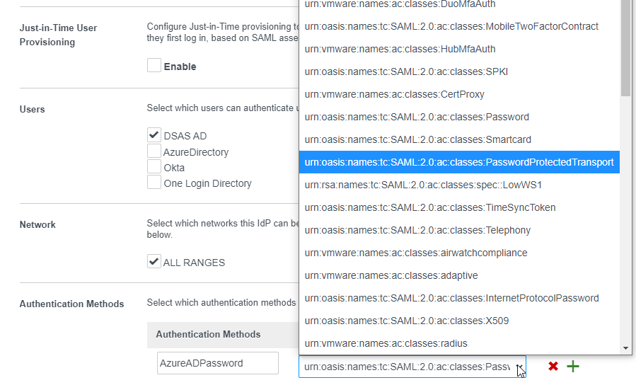 - Under SAML Context, select “urn:oasis:names:tc:SAML:2.0:ac:classes:PasswordProtectedTransport”