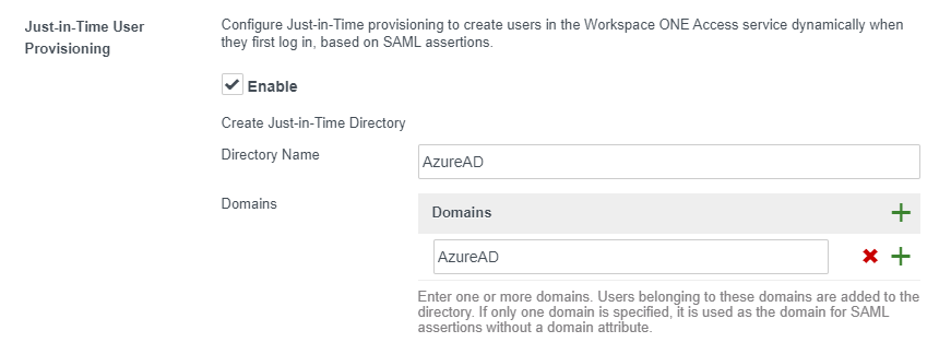 If you are doing JIT into Workspace ONE Access, you will need to enable this when creating the 3rd Party IDP. Enable the Checkbox and provide a directory name and domain name that will be used (internally).