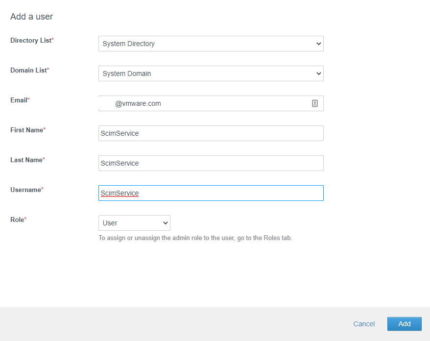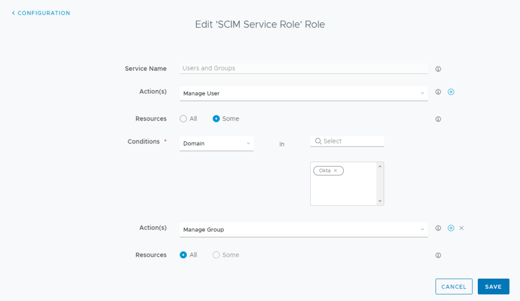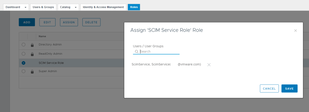 - Click on the roles tab and assign the SCIM service account to the SCIM Role.