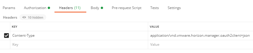 - In the Headers Tab, add a new “Content-Type” which is set to “application/vnd.vmware.horizon.manager.oauth2client+json”