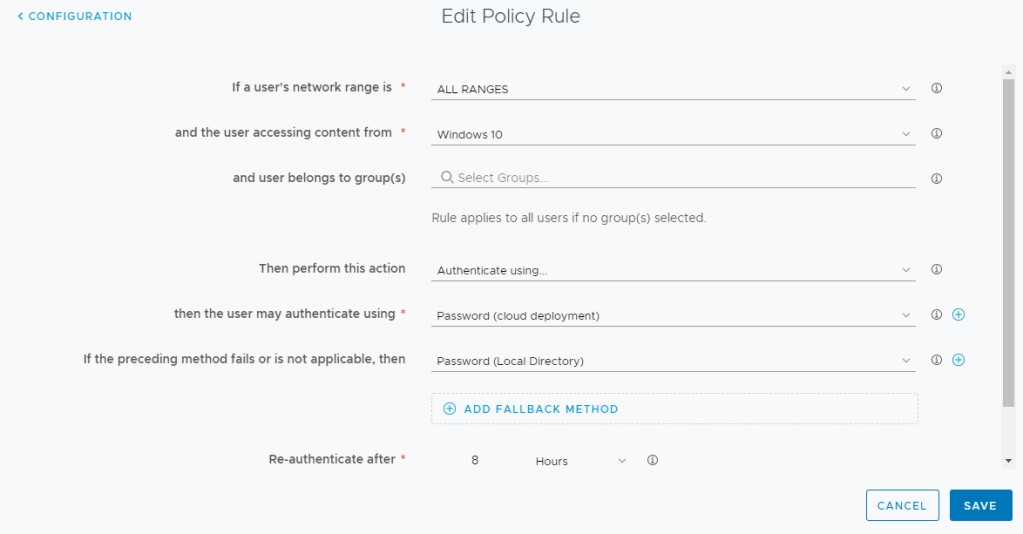 Before you Continue, you need to make sure your Policy in Workspace ONE Access will allow you to authenticate using System Domain credentials without using the backdoor. You will need a policy similar to below for the platform you are using Postman. The Password (Local Directory) needs to be one of the fallbacks (or primary). You will also need to log out of Workspace ONE Access.
