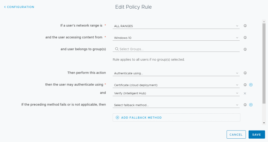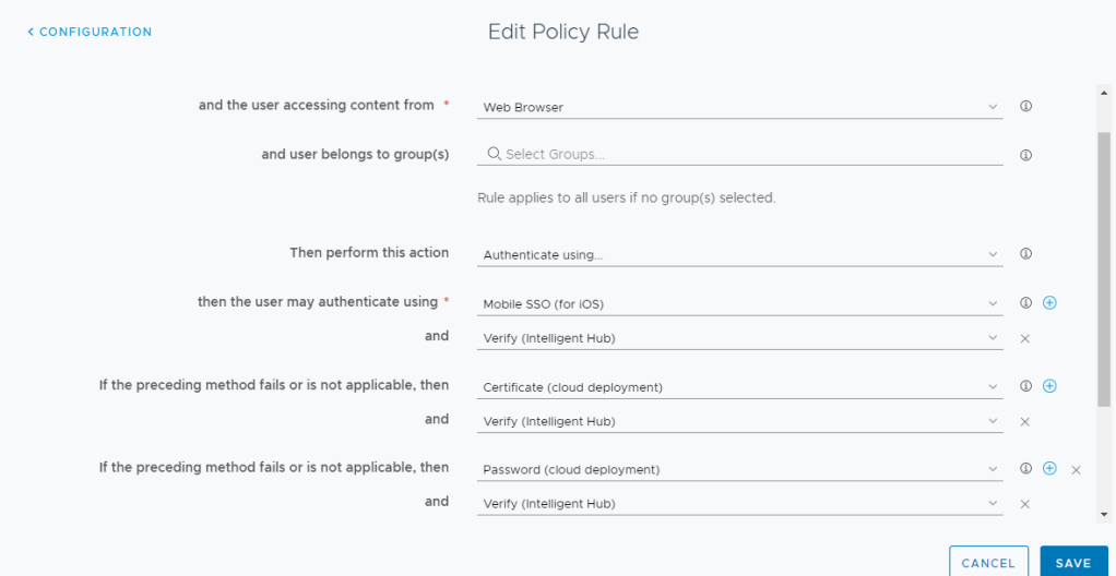 This is obviously not a great admin experience (nor a best practice) especially if you have defined OS specific policies in your Default Access Policy. I’m hopeful that VMware will allow you to configure Verify (Intelligent Hub) on OS specific policies in a future release.