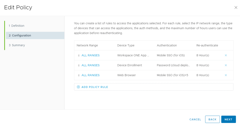 Its always good practice when defining access policies to not use the default access policy for any applications you’ve configured. The Default Access Policy should only be used for Enrollment and the Workspace ONE Portal. All other applications should be configure with a separate policy.