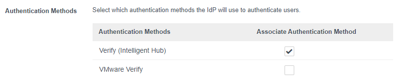 Note: This is the built-in provider that you are using for all your authentication methods such as Mobile SSO. This could be “Built-In” or a custom one that you created when setting up Workspace ONE Access. - Under Authentication Methods, make sure that Verify (Intelligent Hub) is enabled.