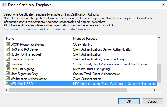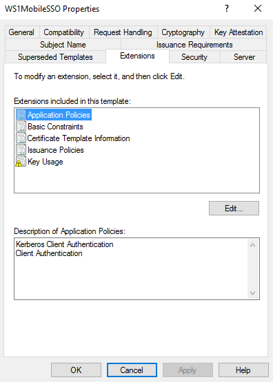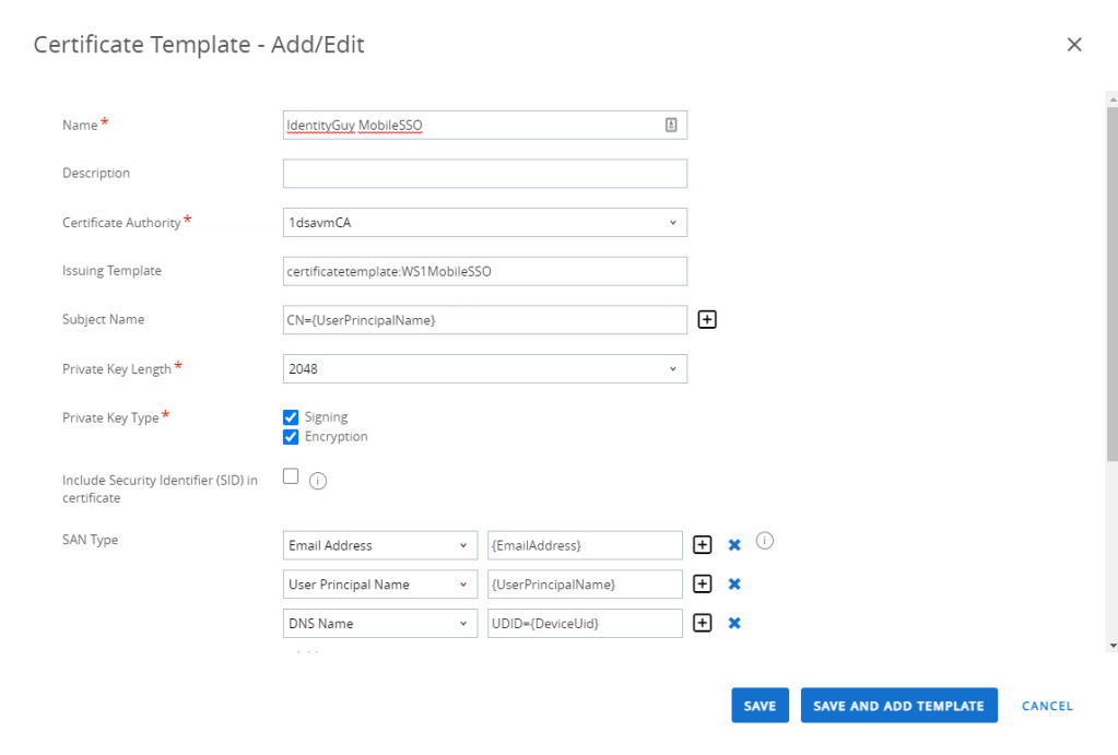 - Enter your Issuing Template in the following format: certificatetemplate:[ADCS-TEMPLATE]. In my lab, my issuing template would be “certificatetemplate:WS1MobileSSO”.