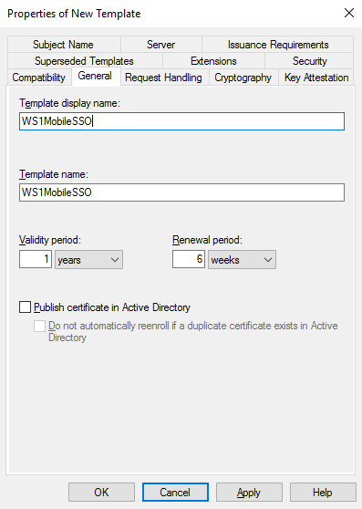- Provide a Name for the Certificate (Don’t use any spaces in the template name) and uncheck “Publish Certificate in Active Directory”