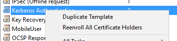- Locate the “Kerberos Authentication” template and Right mouse and Select Duplicate Template