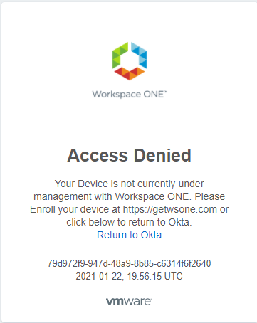 If you want to support this flow with the Original Device Trust (and you don’t have an application sign-on policy that requires MFA for unmanaged devices), you can also configure the original device trust to display a failure on Workspace ONE Access with a “Return to Okta” link that will send them back to the Okta Portal (This custom error can be configured for Factor-Based Device Trust as well). If the user was previously authenticated, they will be automatically logged into the Okta Portal. In this use case, the user will see an customized error similar to below: