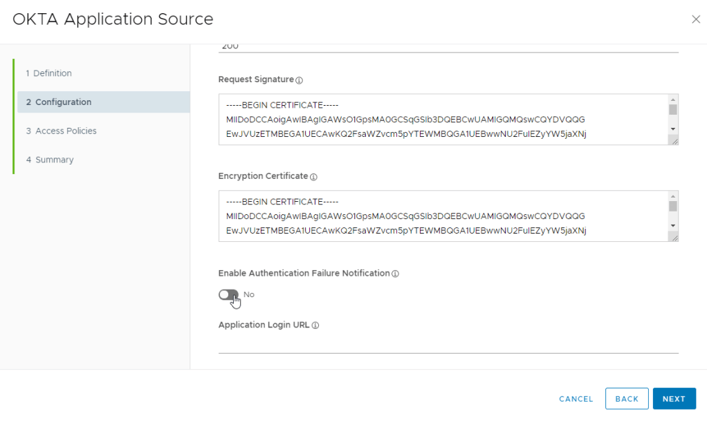 - Disable “Enable Authentication Failure Notification”. This will prevent failures from being sent back to Okta.