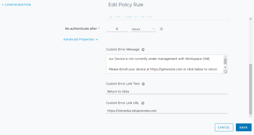 In Factor-Based Device Trust, the experience is very different because Workspace ONE Access will not send any failures back to Okta. The Integration is designed for Workspace ONE Access to display the error.