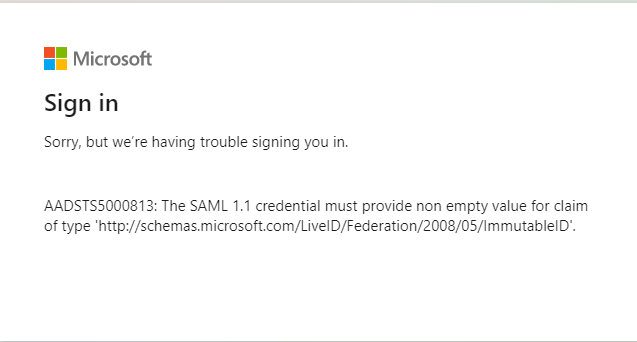 - You received the error “AADSTS5000813: The SAML 1.1 credential must provide non empty value for claim of type ‘http://schemas.microsoft.com/LiveID/Federation/2008/05/ImmutableID’.”