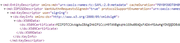 | -SigningCertificate | In your browser, access your IDP metadata: https://xxx.vidmpreview.com/SAAS/API/1.0/GET/metadata/idp.xml Copy your signing certificate from the Signing Section. ![]() I recommend you getting your signing certificate this way to remove all the line breaks that you would have if you downloaded the signing certificate from the access console. |