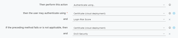 Let’s assume during enrollment, I authenticated using a Password (cloud deployment) + DUO Security.  When a SAAS/Web application is launched from the Intelligent Hub, Workspace ONE Access will match my Password (cloud deployment) authentication method with one of the fallbacks listed and satisfy the first check I mentioned above.  I’ll talk more about fallbacks in the next section.