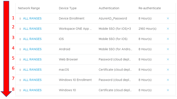 A device type refers to a grouping or categorization of devices based on common identifiers such as the operating system or based on action, such as enrolling your device into Workspace ONE UEM.  In most cases, you will notice that you can match multiple device types, depending on the context.  We will walk through several illustrations of this and how ordering your policy rules are critical to ensure the integrity of your policy definition.
